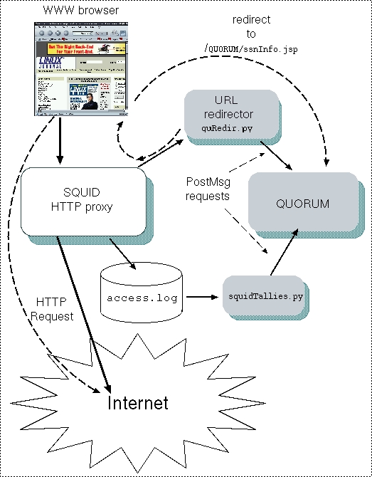 When a user requests a URL, her browser sends the URL request to the Squid proxy. Squid then sends this URL request information to the URL redirector. The URL redirector sends a querySsn message to the QUORUM server to ask if the user has a current QUORUM session and if the user's account is still in credit. If everything is okay, then the URL redirector replies to Squid with a blank line telling Squid to fetch the requested URL.