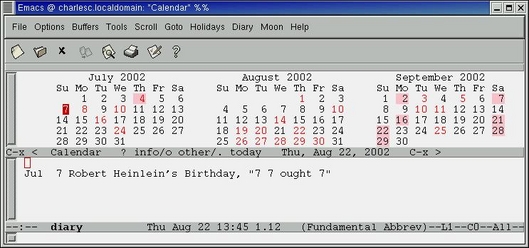 Somewhat more useful than obscure calendars is the diary. With the diary, you can set appointments, anniversary reminders, cyclical events (such as “every third Thursday of the month”) and other types of events. If you specify the event time, Emacs will remind you as the time approaches. Not only is this diary system useful, but it runs in Emacs, so it runs on any computer on which Emacs runs—and that's most of them. The diary file is portable as well.