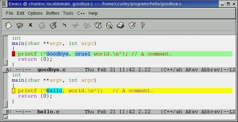 Figure 1. C mode in Emacs, showing font locking (color syntax highlighting). The indenting is courtesy of C mode.
