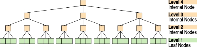 You might think we would number the root level 1, but since the tree grows at the top, it turns out to be more useful for number 1 to be the level with the leaves where object data is stored. The height of the tree depends upon how many objects we have to store and what the fanout rate (average number of children) of the internal and twig nodes will be.