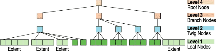 Twigs are parents of leaves, and extent pointers exist only in twigs. (This is a very controversial design decision I will discuss in Part II of this article.) Branches are internal nodes that are not twigs.