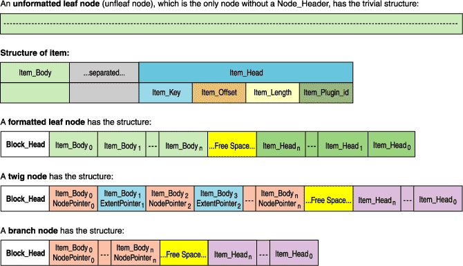 Reiser4 includes many different kinds of items designed to hold different types of information: