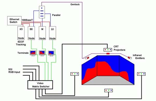 The projectors of the SSVR are connected to an Extron CrossPoint Plus 124 matrix video switcher. The switcher is capable of accepting video input from 12 sources and output to four sources.
