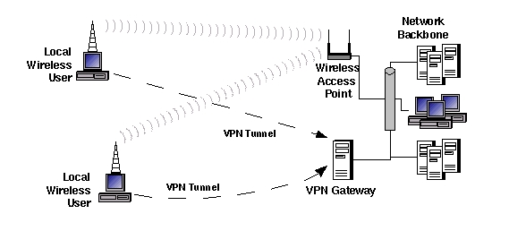 Remote-access VPNs, including the kind used over wireless LANs, are slightly different. Rather than connecting an entire network to some other network, a remote-access VPN tunnel connects a single user or computer to a remote network (Figure 2). Typically, the user's local VPN gateway is simply a software application running on her local system (the remote VPN gateway is usually a firewall or dedicated VPN device on the home network).