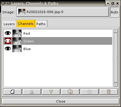 Bring up the Layers dialog (Ctrl-L) and click on the Channels tab. Then deselect the Red and Blue channels. The Layers dialog should look like Figure 3, with only the Green channel highlighted. We haven't turned off the visibility of these two channels, so the image window won't look any different. But by selecting only the green channel, our fuzzy select examines only the green channel pixel values in deciding which adjacent pixels to select.