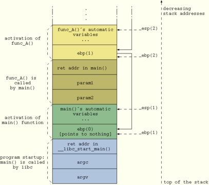 In the case of the i386 platform (in glibc-x.x.x/sysdeps/i386/backtrace.c), a couple of lines of assembly code are used to access the contents of the ebp and esp CPU registers, which hold the address of the current stack frame and of the stack pointer for any given function: