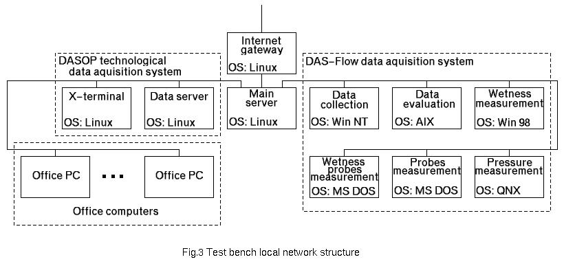 All computers are connected to the local network, split into three segments (see Figure 3). The first segment includes all the DAS-Flow computers; the second, the DASOP computers and office computers; and the third looks to the outer world via the leased line. The third segment includes only one computer, which acts as our gateway to the Internet, with a firewall based on ipchains and mail server.