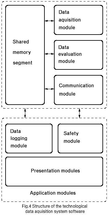 The socket communication module provides access to the shared-memory segment for the remote application modules. There are several application modules. Some of them can be run locally with direct access to the shared-memory segment with measured and evaluated data; another can do it remotely via the communication module. Application modules include data logging modules, a safety control module and data presentation modules.