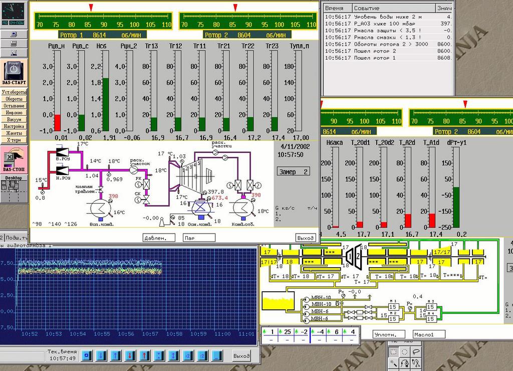The DASOP system was built by ourselves to provide on-line control of the whole bench during the test. It works in real-time mode, collecting data from more than 150 pressure, temperature, speed of rotation and vibration sensors. This data is presented for operational personnel on two monitors and a serial terminal in the control room (see Figure 2) and includes information about the current state of water, oil and steam systems of the bench. DASOP also provides a safety control, with some warning and emergency levels.