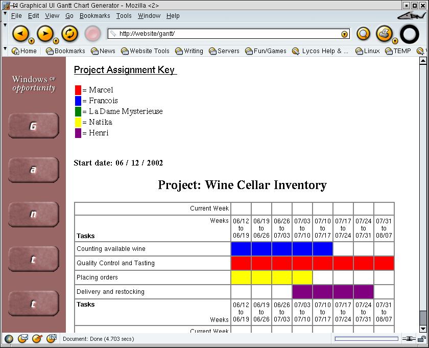 I should tell you that you need to do this as root. If you have never run a Perl CPAN install before, you will be asked a number of setup questions. This only happens once, mes amis--other than that, it is a very smooth process. To use the package, point your web browser to the appropriate URL. On my system, it looked something like this: http://webserver/gantt/.
