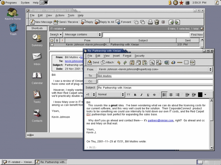 Probably the best application that makes use of the GNOME libraries is Ximian's e-mail client, Evolution. It was rated by Linux Journal in November 2002 as one of readers' favorite e-mail clients available for Linux. Evolution allows for multiple POP and IMAP accounts. It comes with e-mail filtering, spell checking and the ability to attach binary files. Although it works with standard POP and IMAP servers as is, with the addition of Ximian's proprietary Connector, users can connect to a Microsoft Exchange server for group address books and appointment planning—an important compatibility component.