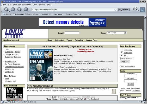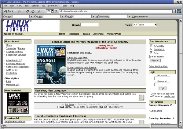 By far, two of the most popular web browsers are Mozilla (Figure 11)--based upon the same rendering engine as its commercial counterpart, Netscape Navigator—and Galeon (Figure 12), a web browser that sports many of the same features as Mozilla and is part of the GNOME desktop.