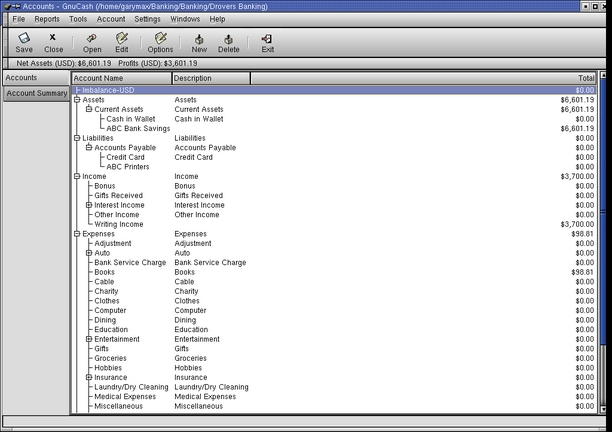 What is really nice about GnuCash is you can customize it to suit your personal financial situation. A list of common accounts comes ready-made—expenses, income, stocks, investments—each with its own sub-account structure. However, you also can add your own accounts and delete those you don't use (Figure 17).