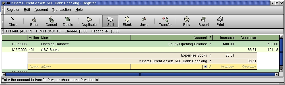 Another nice feature of GnuCash is the ability to split transactions, so you can include several debit or credit accounts in a transaction. This allows you to fine-tune a transaction and show every account involved in a specific financial activity.