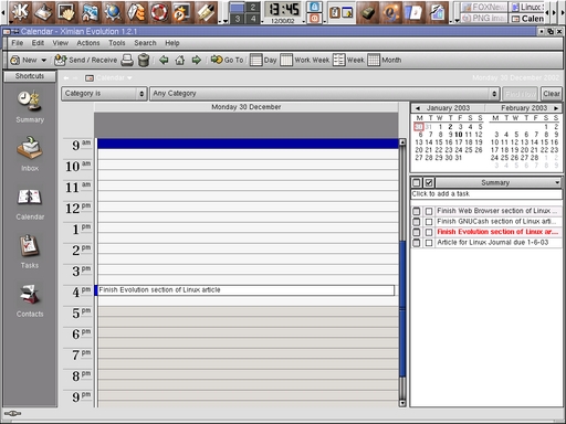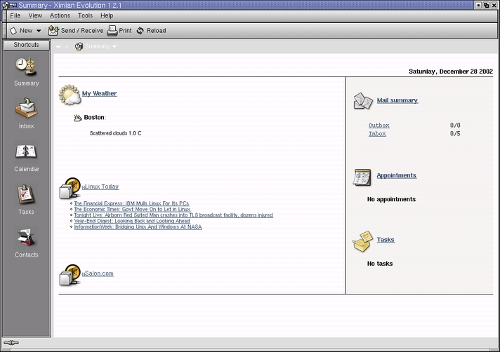 Although Linux has many available options for both contact managers and e-mail, I prefer to combine them. Doing so makes things more convenient—everything is right there, so I don't have to open two different applications. Ximian Evolution fills this need quite nicely. It is at once an e-mail client and a contact manager/task scheduler, and it provides the writer/consultant with a one-stop information resource. Upon starting the program for the first time, you will be taken to the summary screen (Figure 5).