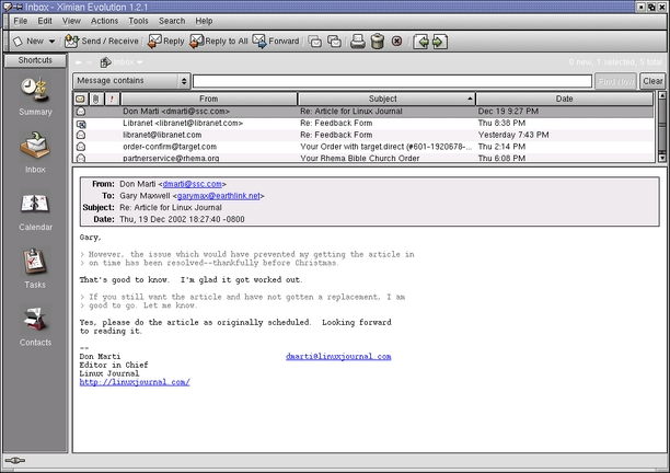 Along with weather information and a listing of recent articles about Linux, Evolution shows how many messages are in your inbox and outbox. It also shows any pending tasks or appointments for the day. Down the left-hand side of the Summary Window are the different areas within Evolution that allow you to set up appointments, schedule tasks and send and receive e-mail. Clicking the Inbox icon will take you to Evolution's e-mail client (Figure 6).