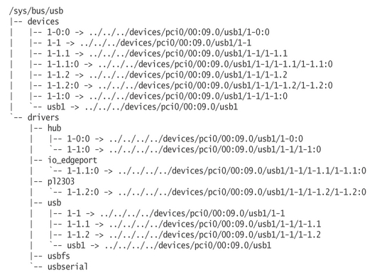 For example, the following device is an eight-port USB-to-serial device on the first USB bus in the system. Its location in sysfs is /sys/devices/pci0/00:09.0/usb1/1-1/1-1.1. Within that directory are the following directories and files: 1-1.1:0/, bcdDevice, bConfigurationValue, bDeviceClass, bDeviceProtocol, bDeviceSubClass, bmAttributes, bMaxPower, bNumConfigurations, bNumInterfaces, idProduct, idVendor, manufacturer, name, power, product, serial, speed, ttyUSB0/, ttyUSB1/, ttyUSB2/, ttyUSB3/, ttyUSB4/, ttyUSB5/, ttyUSB6/ and ttyUSB7/.