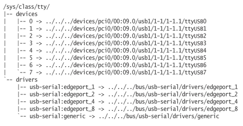 The dev file contains the major and minor number for this specific device, which then can be used to determine the proper device node for talking to it. In the /sys/bus/usb directory, this USB device is seen as being bound to the io_edgeport USB driver (Figure 3).