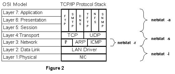 Let's look at some examples to see what netstat can do. Figure 2 shows the different outputs of the netstat command with different switches at virtual layers of the OSI model.