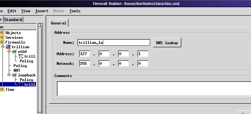 Believe it or not, even after all this work we're not done configuring the firewall object. In Figure 4 you may have noticed that in the hierarchical view of objects on the left-hand side of the window, the firewall Trillian has two interfaces, eth0 and lo. The eth0 subsection was created automatically when I ran the Insert firewall dialog. lo, which represents Trillian's loopback interface, had to be created manually. It's a little odd that its creation doesn't happen automatically. Every firewall, whether a multihomed host or a bastion host, needs rules that allow its loopback interfaces free rein (so local processes aren't interrupted).