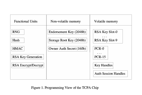 A TCPA security subsystem includes both hardware and software components. Functions provided by hardware are called TPM (trusted platform module) functions; those provided by software are TSS (trusted support services). From a programmer's perspective, the IBM version of the TPM (or TCPA chip) looks like Figure 1.