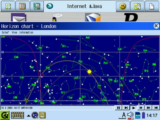 Another interesting feature of the SL-C700 is the complete Java support. I always am looking for more knowledge of the sky and galaxies, so sky maps are the first applications I install. I went to the Solun web site at www.piecafe.demon.co.uk and downloaded the Java version, designed for the SL-5500. It worked like a charm on the SL-C700, after some minor tweaks to use the 640 × 480 resolution. The high resolution allows comfortable use, even if the lack of memory quickly reminds you the SL-C700 is not perfect.