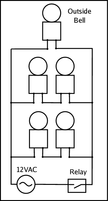 With the requirements defined I began to formulate a plan. Five new 12VAC bells and a 12VAC power supply were purchased. These are the same type of bells commonly used in alarm systems or any sounding system. The bells physically hammer themselves in the same manner as an old alarm clock, and they pump out the decibels. The bells needed to be wired so that connecting two wires would ring all the bells in the plant.