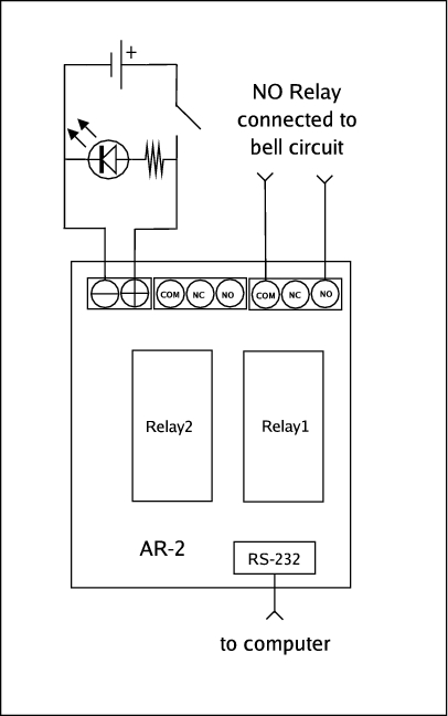 To control the bells, we needed to close the bells' circuit temporarily. I was pointed toward a specific relay device, the AR-2, that can be controlled by a computer over a serial port. This device would be used to complete the bell circuit, causing them to ring. The AR-2 is sold by Electronic Energy Control, Inc. (EECI) for about $44 US. It has two relays on a circuit board, and both can be connected as normally open (NO) or normally closed (NC) relays. Only one relay wired as NO would be used for this project. An enclosure (EN-B) to house the board also was purchased. An emergency on/off switch was mounted on the enclosure for use in case something went terribly wrong. The AR-2 is documented well enough that I knew it would be possible to write a program in C to control it. This program could be scheduled using cron jobs.