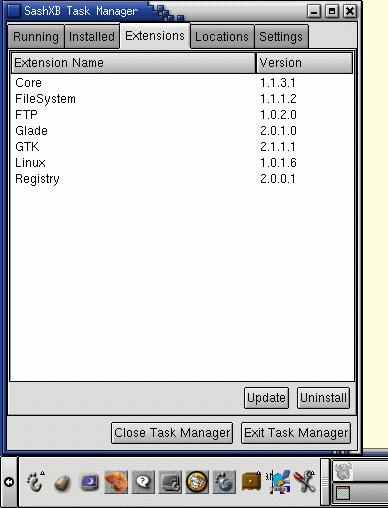 The installed extensions are listed in the Extensions panel of the task manager. Notice that only the Console location currently is installed; we need the others. Download and install the WindowApp and PanelApp locations by typing: