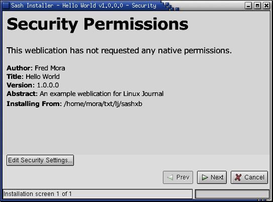 Now, let's install this brand new application with sash-install helloworld.wdf. If everything was done correctly in the WDF editor, you now should see a panel similar to the one in Figure 2. Click on Next, go back to the task manager and select the Installed tab. The title of your newly installed weblication should be listed there.