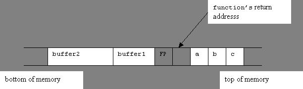 This program is guaranteed to cause unexpected behavior, because a string (str) of 27 bytes has been copied to a location (buffer) that has been allocated for only 16 bytes. The extra bytes run past the buffer and overwrites the space allocated for the FP, return address and so on. This, in turn, corrupts the process stack. The function used to copy the string is strcpy, which completes no checking of bounds. Using strncpy would have prevented this corruption of the stack. However, this classic example shows that a buffer overflow can overwrite a function's return address, which in turn can alter the program's execution path. Recall that a function's return address is the address of the next instruction in memory, which is executed immediately after the function returns.