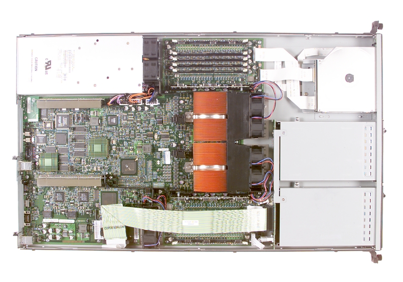 Figure 2 is a top view of the system. The two copper heatsinks are the processors. Two speed grades are supported: the 1.6GHz Opteron model 242 or the 1.8GHz Opteron model 244. The Opterons link to each other and to the chipset using HyperTransport. The CPU-to-CPU bandwidth is 3.2GB/sec—in each direction (full-duplex). The Opterons each have an internal memory controller that supports ECC DDR SDRAM at a bandwidth of 5.33GB/sec (each). There are two banks of memory, one next to each processor.