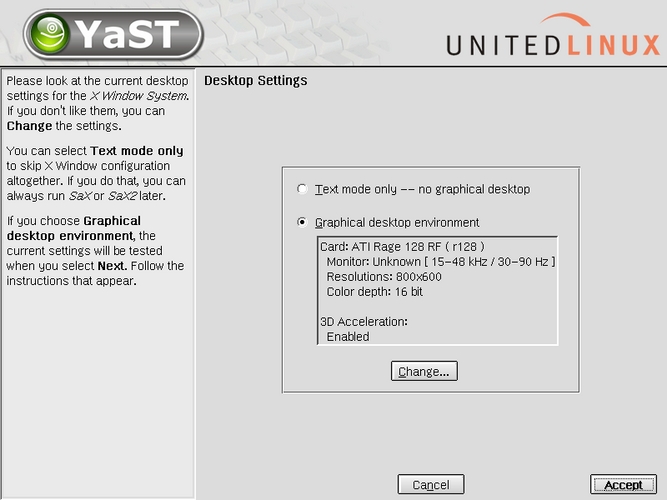 The installer is a rebadged YaST2 installer from SuSE. It correctly detected most of the hardware in my test system and set it up with sensible defaults. It partitioned my disk and set up ReiserFS on the main partition.