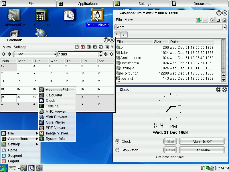 Now the good news: you can find and use the traditional OPIE tools and the Konqueror browser. PCMCIA works, the USB slave port works and a pre-alpha smart card driver exists, but there's not yet such a driver for the Windows CE SIMpad. Moreover, a SIMpad with the ck1sp1 OPIE image was shown at CeBit this year, where a very active German community is working on Linux support.