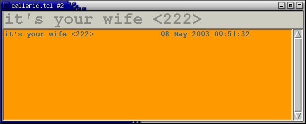 In the extensions.conf file, an entry called callerid.agi calls an AGI script. This is a simple example illustrating the AGI interface. The script is placed in the /var/lib/ asterisk/agi-bin/ directory and is invoked by Asterisk as an external process. AGI and Asterisk communicate through stdin, stdout and stderr. Variables are passed in to the AGI through stdin, and the AGI can pass information back to Asterisk through stdout. Messages destined for the Asterisk console are written to stderr. Two parameters always are passed to the AGI: the full path to the AGI and the arguments that are passed to the AGI through the exten entry. The AGI collects the callerid and sends it to a GUI application running on another machine. The GUI application can be retrieved from my Web site (see Figure 2). AGI scripts also can be used to retrieve information. If you need to query a database for information about the call or the user, you can use the AGI interface as well.
