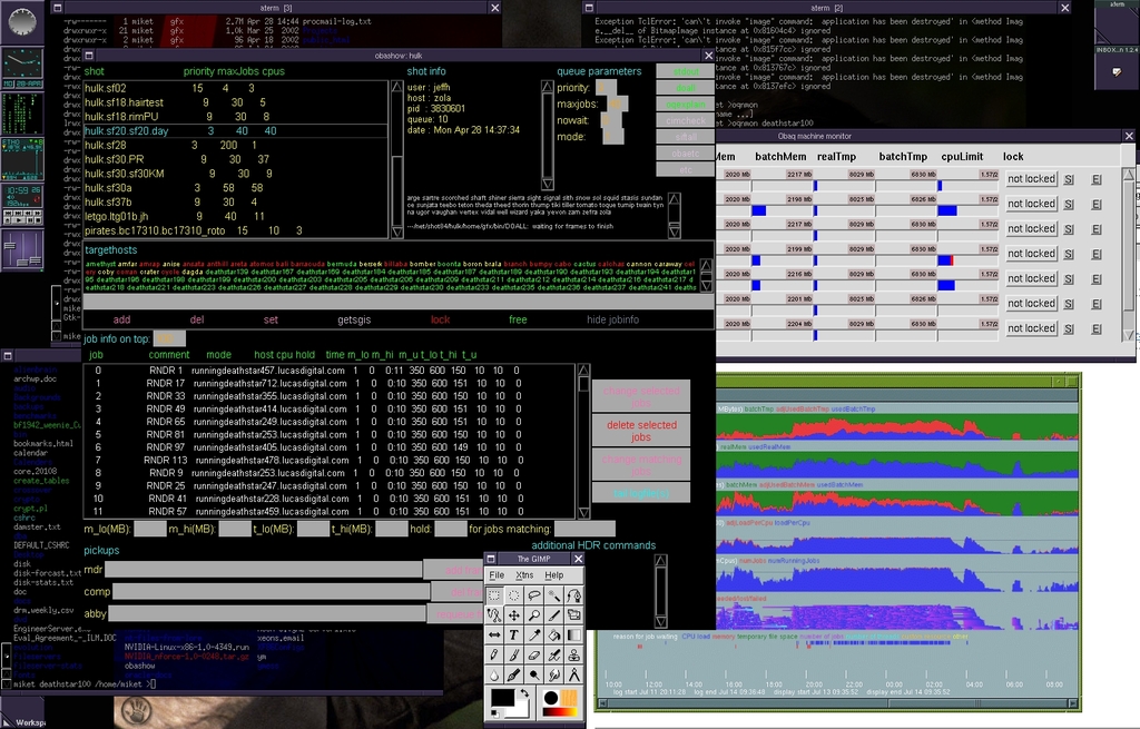 “Our attempt to replace ObaQ with a centralized resource management system called the IMP Project didn't work out”, says Hess. “We went back to ObaQ, and the Linux port of that took about two weeks. Three or four months ago, Florian decided he was going to fix that so any show could use any machine.” ObaQ is a peer-to-peer (P2P) scheduler system. The advantage of a P2P scheduler is that a scheduler server failure won't knock the entire system off-line. ObaQ2 uses a single machine for global scheduling, but it advises only independent machines running ObaQ. Losing the ObaQ2 server won't bring the entire facility down. There are scheduler system alternatives, such as the popular proprietary product Platform LSF or the open-source Condor and OpenPBS schedulers, but ILM plans to continue to use ObaQ.