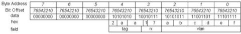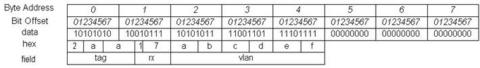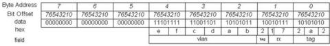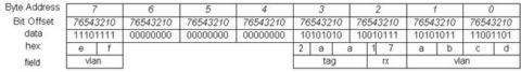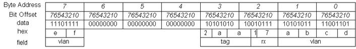 Do you see what happened? The vlan field has been broken into two noncontiguous memory spaces: bytes[1:0] and byte(7). It violates Kevin's Theory #1, and we are not able to define a nice C structure to access the in-contiguous vlan fields.