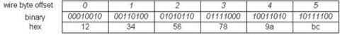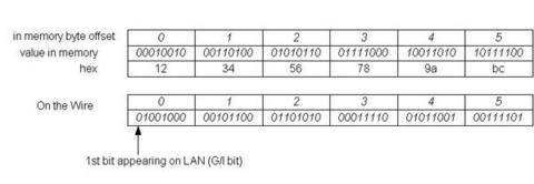 Notice that the MAC address field of the Ethernet header is considered as a string of characters, in which case the byte order does not matter. For example, a MAC address 12:34:56:78:9a:bc has a layout on the wire like that shown below, and byte 12 is transmitted first.