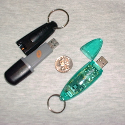 Figure 1. Two USB flash drives. Left: my 32MB Easy Disk. Right: my wife's 128MB Soyo Pen Drive Pro. The Easy Disk's attachment point is on its dustcap, which thus remains on your key chain, belt or wherever, while the business end is in use. Soyo (like most flash drives, unfortunately) flubs this by putting its attachment point on the wrong end.