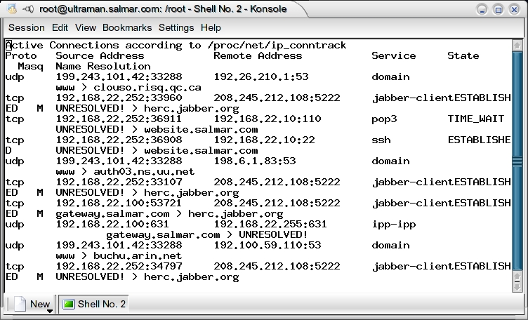 By default, the output shows all connections, including the masqueraded ones. To limit the output to masqueraded connections only, use the -m option. The reverse effect (no masqueraded connections) can be achieved with the -d option. Have a look at Figure 1 for a sample of the output.