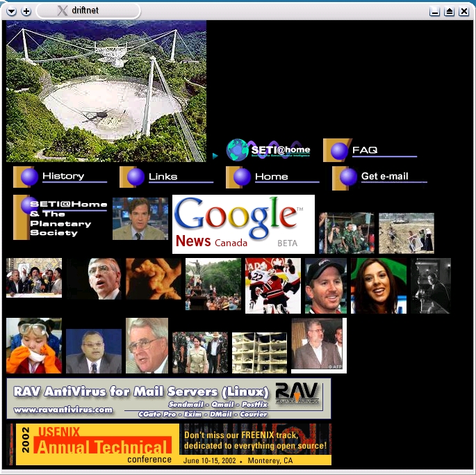 For a truly terrifying (or amusing, depending on your perspective) view of exactly what is flying across your system, run Driftnet. The name itself should be enough to send shivers up your spine. Simply put, Driftnet listens on a selected interface for image or video traffic (MPEG only), then displays the images it finds. Whether this display is more frightening to the system administrator who finds out what users are watching or to the users themselves, depends on more factors than we adequately can cover here. That said, this collection of images is completely indiscriminate and doesn't in any way point to a specific user.