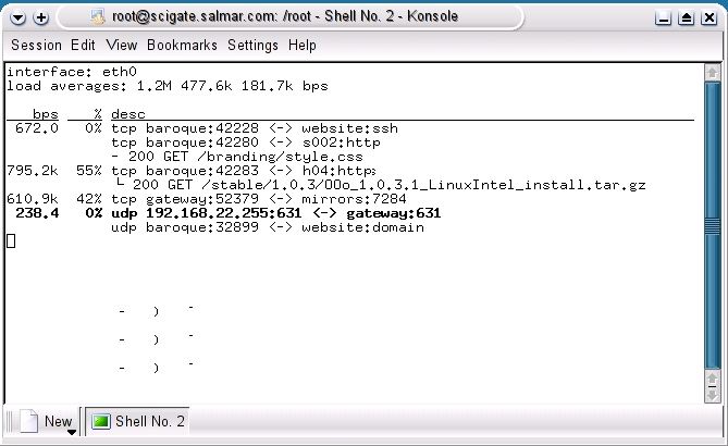 David Leonard has created an ncurses-based program called pktstat (www.itee.uq.edu.au/~leonard/personal/software/#pktstat) that does a nice job of showing you what percentage of bandwidth each connection uses. It also keeps a running load average in the style of uptime but tracks network transfer rates rather than processes in a run queue. What sets the program apart is its ability to display filenames associated with the packets sailing across your Web server or files being downloaded from client PCs on your network. Building pktstat is a matter of extracting the source, switching to the directory and typing make: