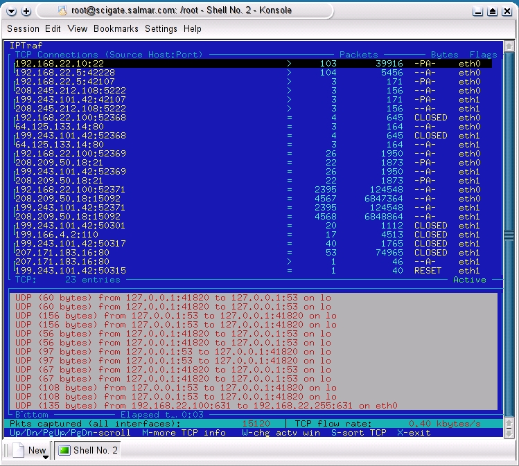 Speaking of traffic, if you are looking to concentrate your efforts simply on what and where your network is being used, the final item on tonight's menu may be more appropriate. IPTraf is one of your humble chef's favorite IP-traffic monitoring tools, one that I go back to time and again. This is a ncurses-based application that displays IP traffic, byte and packet counts (including non-IP packets), UDP traffic, incoming vs. outgoing traffic and more. IPTraf is a package every person in charge of a network should have handy.