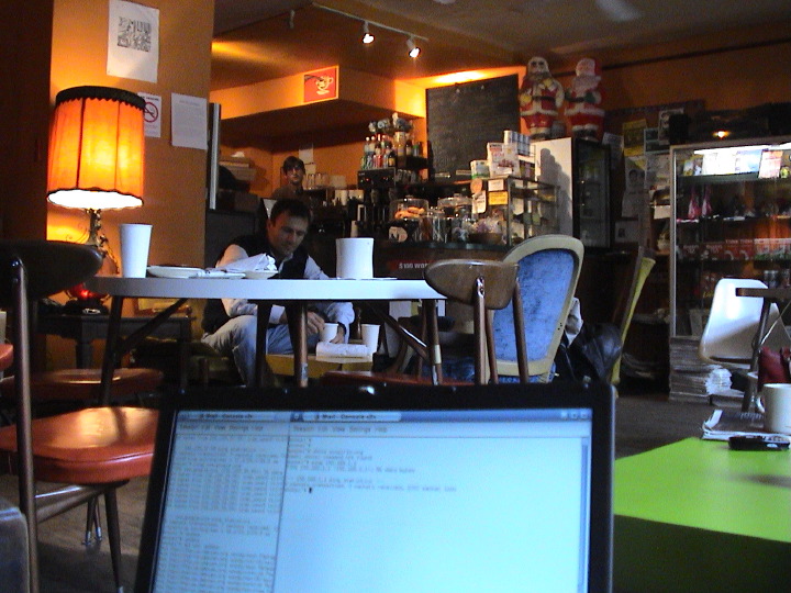 As it happened, the APs for both Alt.Coffee and NYCwireless were down while we were there, but when we walked around Tompkins Square Park, we still found at least one home node with an open and usable connection. And yes, of course we used it.