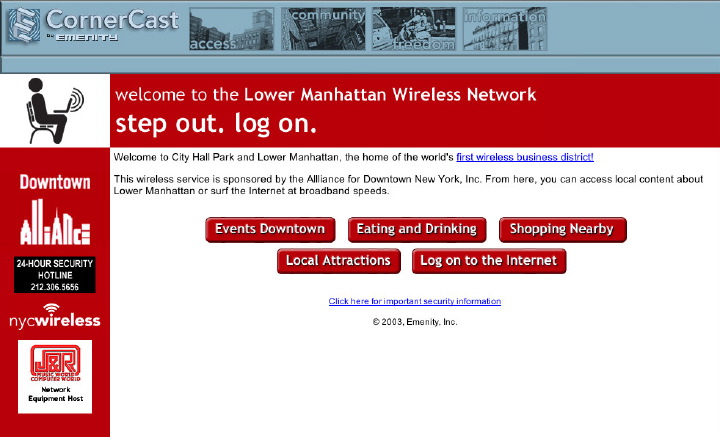 Emenity's biggest customer is the Downtown Alliance, a business improvement district (BID) organized to “create and promote a safe, clean, live-work, totally wired community”. BIDs throughout the city are supported by a small additional local sales tax. Improvements to Bryant Park—which are nothing less than spectacular, considering the no-mans-land it used to be—are examples of a BID at work. Because the alliance serves landowners, it also can approach them with requests to use their roofs or windows for wireless antennas aimed down at public spaces.