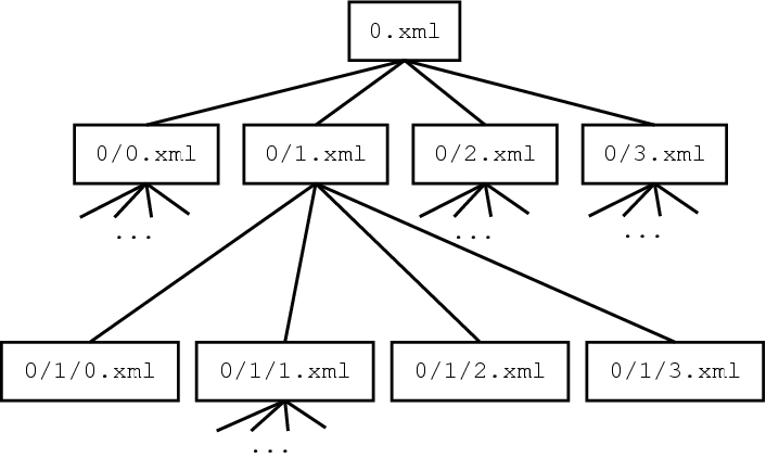 Re-examining indexing methods based on these constraints yielded an interesting solution: B-trees and hashes are the two most commonly used indexing methods. I chose to use B-trees due to the fact that a filesystem organizes files in a tree; this could be used to store the structure of the B-tree, saving some precious space in the process. Second, the key/link pairs could be analyzed, and a balanced B-tree could be created. The structure of the XML files themselves was kept as minimal as possible, so single-letter tags were used as a space-saving move.