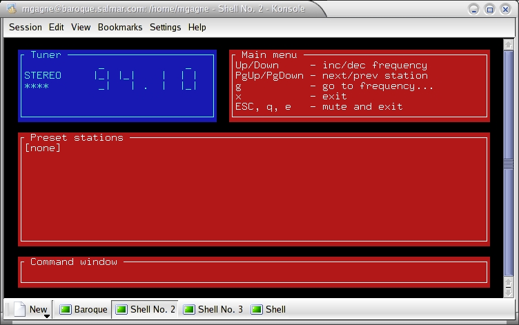 Watching television is obviously the point, but these TV tuner cards sometimes have FM radio receivers as well. Watching television while you are trying to work might qualify as distracting. Listening to the radio isn't as problematic. An FM radio program that caught my eye is Gerd Knorr's frightfully simple radio program (bytesex.org/xawtv). This is an ncurses-based program that comes as part of the xawtv source package. I make a point of specifying source here, because the package, called radio, is separate from xawtv when you work with RPMs.