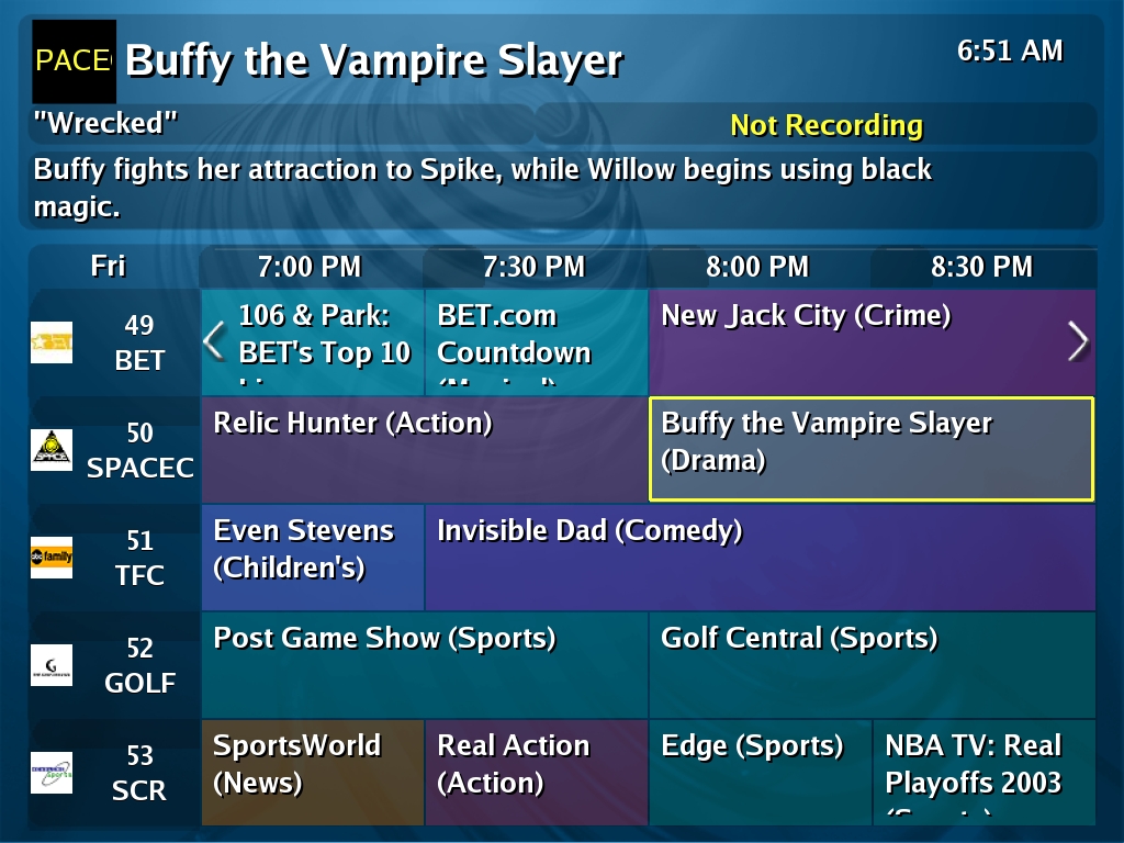 Imagine if you will, a digital video recorder that lets you view live TV, with instant replay so you can pause, rewind and fast-forward through the action. MythTV lets you program shows on a timer and view on-line television listings on which you can do string searches—looking for a particular episode of a Buffy rerun? Combine this with support for multiple TV tuner cards, multiple simultaneous recordings and a distributed system so you can set up different MythTV boxes on your network. Wrap it all up in a slick, themeable package and you are starting to get an idea of what I am talking about.