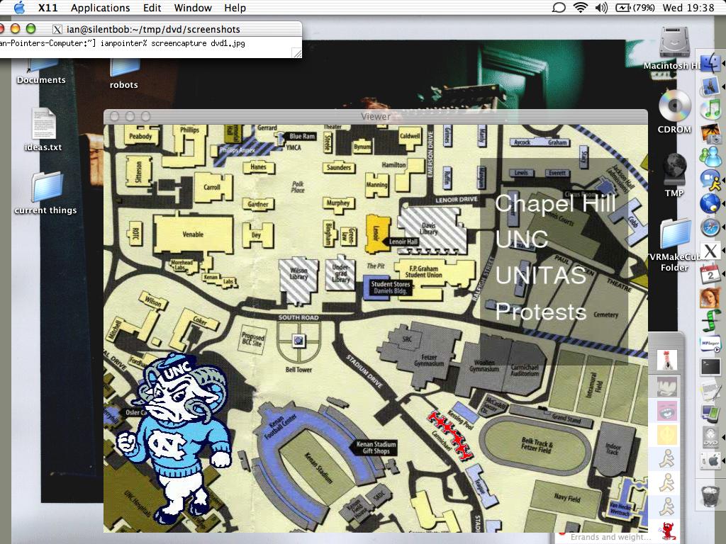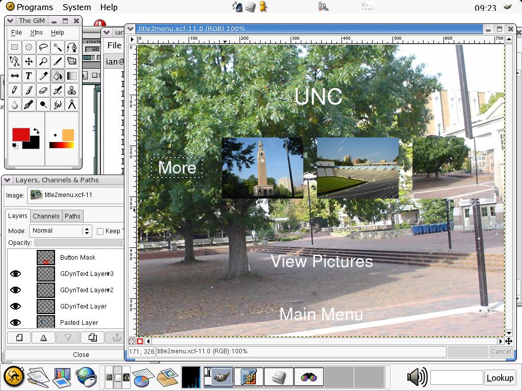 The DVD application I'm creating is a photo album, using pictures that I took while studying abroad at UNC-Chapel Hill this past year. For simplicity's sake, I have only six photos in each category. On paper, I decide that the main menu (the VMGM unit) should have five buttons, four of which are simple text buttons (one for each different photo category), plus a secret link unlocking extra pictures (secret extra features are a common occurrence in commercial DVDs) and a music track playing in the background. The four regular buttons link to one of four menus, one for each different section. The menu system for each section consists of two menus and an audio track, with selectable preview images of the slideshow, a button to move onto the next set of preview images and two buttons that allow the viewer to watch the complete slideshow or go back to the main menu. To keep things simple, the photo slideshow should have the same song as the section menu playing in the background. After the slideshow is finished, the viewer is sent back to the section menu. The secret link is a short slideshow with no menu, but it has two different music tracks that the viewer can switch between while the video sequence is playing.