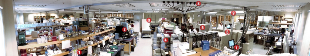 Figure 1. A panorama of our sequencing lab: 1) barcodes representing procedures, 2) the Tango liquid handling platform, 3) –112°F freezers, 4) power supplies for thermocyclers, 5) ABI 3730XL sequencers, 6) ABI 3700 sequencers, 7) x330 sequencer control cluster, 8) network/power connections and 9) vent ducts for sequencers.